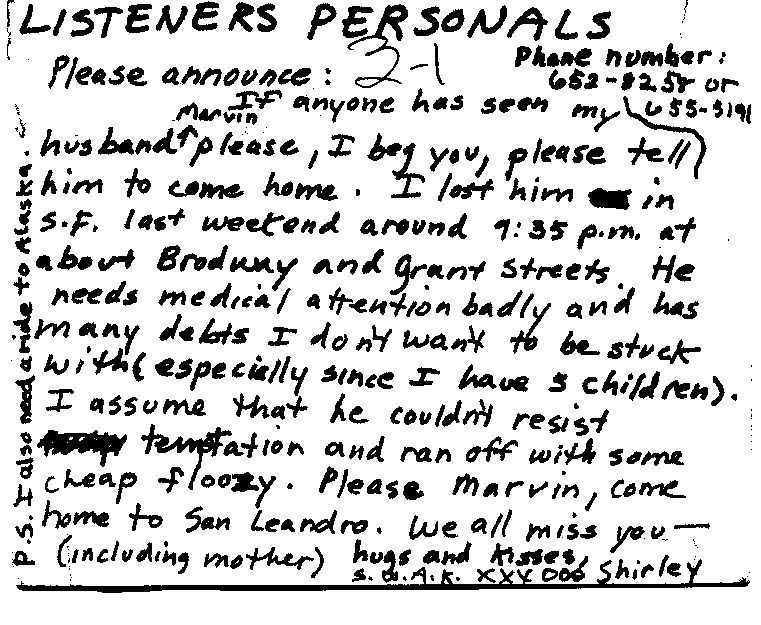 Until I was 12 (1966), I was never in one place, or with the same grownups for more than a year. I (was) moved (again) in 1966 and ended up in suburbia in Livermore in a very religious (read �fundamentalist�) foster family. Sometime in the next year I got an FM radio and listened to it at night, smothering it under a pillow because it was �against the rules.� It became �Radio Free Livermore� for me. I was pretty na�ve about how the world worked, but knew something was wrong in my life. I zeroed in on the news. Dave McQueen and Scoop Nisker were lighting a path that I was eager to travel. Even though I was a �kid�, I felt I was going to be a part of a family someday � something I hadn�t had at that point in my life. And KSAN was the place where people gathered and spoke to each other.
